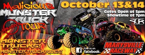 Marysville, CA (October 4, 2017) …. For the first time ever, The Malicious Monster Truck Insanity Tour is coming to Marysville Raceway on October 13th and 14th. These ground vibrating, car crushing, high flying Monster Trucks are geared up to entertain the Marysville Raceway fans with their biggest show ever.