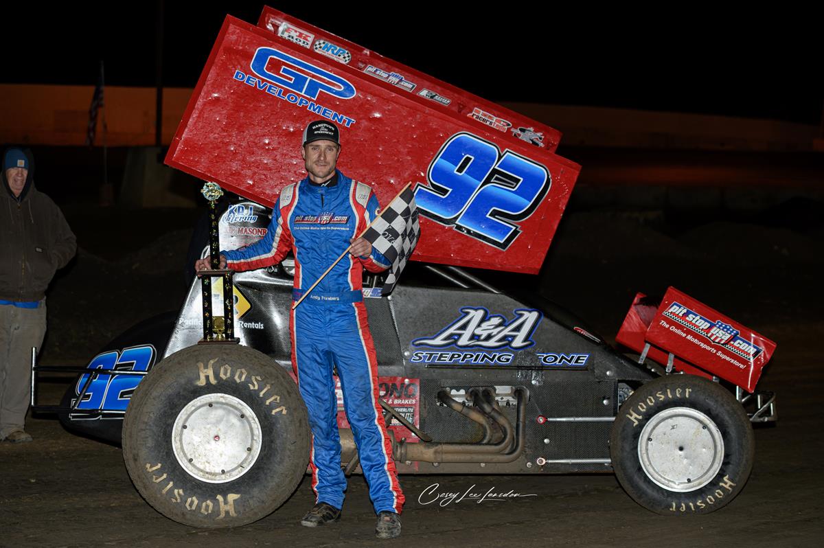 Bradley Terrell passed Shane Hopkins on lap seven to secure the lead during the Hunt Magneto Wingless Sprint Car Series 25-lap feature. Seventh place starting Jake Morgan moved into second on lap 11 and began to close in on Terrell. Those two put on a great show. In fact, as the two raced in and out of traffic, they defied logic and put on the best race of the night. The two were side by side on the final lap. Terrell never waivered and beat Morgan to the checkered flag by 0.170 seconds. It was a close finish. Dan Gonderman rounded out the top three. D Johnson started 10th and finished fourth. Early leader Hopkins ran fifth. Jake Morgan won the drivers title while Barry Pries Jr. is the car champion.