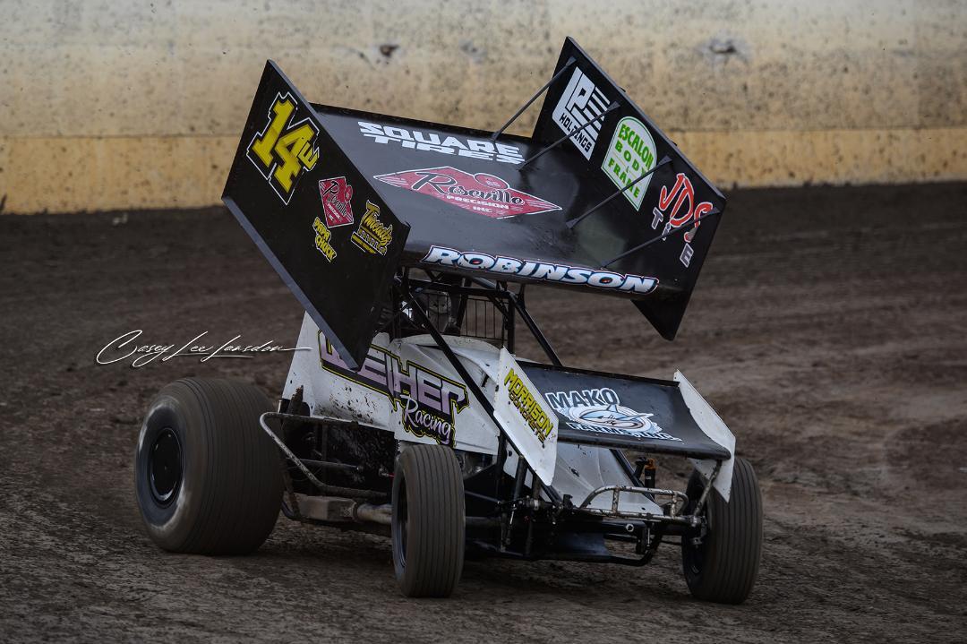 Blake Carrick took the early lead during the 25-lap winged 360 sprint car main event. On the next circuit, Carrick hit a hole that was developing in turn one and his car drifted up the track. This allowed Ryan Robinson to attack and take the lead. Yet, Carrick did not give up and passed Robinson back. This back and forth action continued for two more laps until Robinson secured the top spot and drove away. On lap six, the leaders started to battle slower cars. Robinson missed his line entering turn three and drifted up the track. Carrick dove to the inside and took back the lead. Unfortunately, Nick Larson caused a yellow and the race was slowed. This also gave the lead back to Robinson.