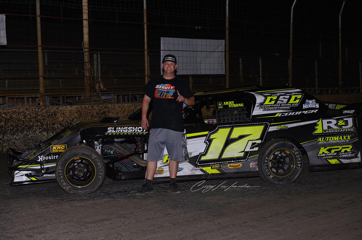 The IMCA Sport Mods were also on hand. Seventeen drivers suited up for the special Monday night race. Todd Copper led all 20-laps to capture the win. While Cooper was the class of the field, the race still featured a tight battle for second on back. Jimmy Ford once again did a fantastic job in holding a smooth fast line around the quarter-mile raceway and earned a second-place finish. Scott Savell at points throughout the race had to hold off a hard charging Michael Johnson, Timothy Allerdings and Phillip Shelby. Unfortunately for Shelby, on lap 10, he spun in turn one. At the point of his spin he had raced his way into the top three. Johnson started deep in the field and charged up to the front. His car seemed to fade just bit in the later stages of the race and he fell back to a fifth-place finish. Savell held off Allerdings by just a mere 0.323 seconds for third.