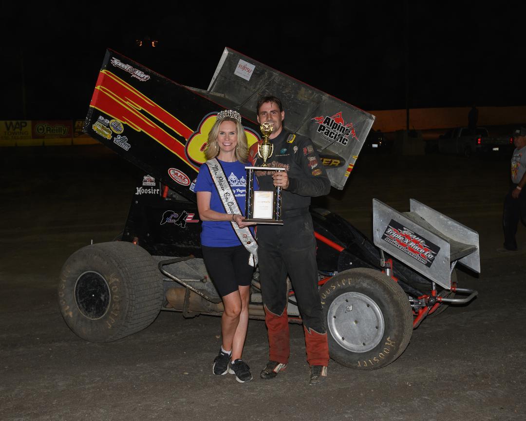(Marysville, CA 7/29/20)…August 9th to 16th is this years Shark Week on the Discovery channel. Celebrities scheduled to appear during that upcoming week include Mike Tyson, Will Smith and Shaq. Yet, one local celebrity also needs an invite. Sean Becker, the Shark, won the 25-lap winged 360 sprint car main event during Wednesday nights Wide Open event. Chico’s Michael Ing, fresh off his fast time award, started on the pole and led the early laps of the main event. Ing, who post-race admitted he heard the theme song from the movie Jaws, then saw Becker drive by him for the lead. From there on out, it was all about Becker. He did survive Blake Carrick, who passed Becker on a restart, but it was nullified because of a yellow. Becker held off Carrick the final few laps to win by less than a second. Tanner Carrick finished third. Ing was fourth and Steel Powell charged to a fifth-place finish in his first start for Standley racing. The blood thirsty Becker said in victory lane that he credited his win to all those laps he swims in the ocean to stay in shape.