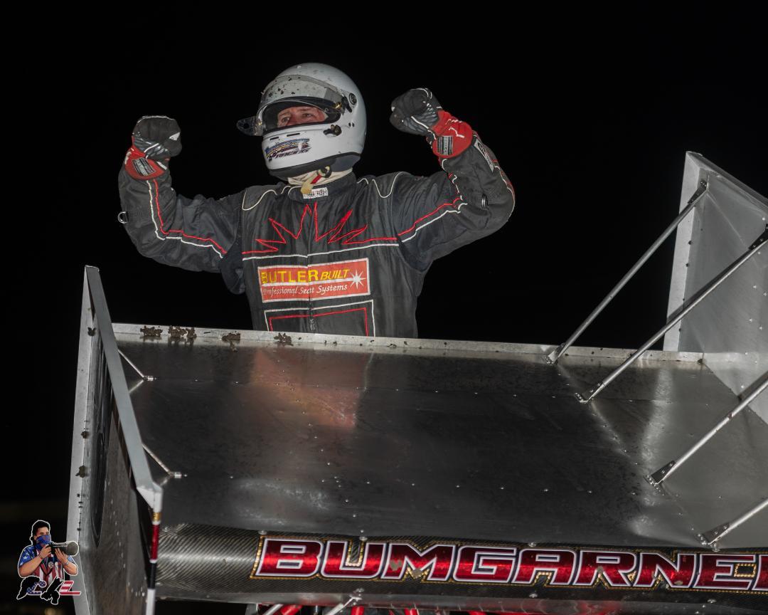 Mike Monahan led the 19-car field to Jimmy Stewards green flag. Chasing Monahan was Brad Bumgarner and Bobby Butler. Carson Hall, making his first career sprint car start at Marysville, spun in turn two, on lap two, to bring out the first caution. Butler had a rough going of it early on and at one point spun, but regrouped, and did not cause a yellow. While he did lose some spots, it was a great move by Butler to keep going. Monahan did all he could do to hold off Bumgarner; however, on lap 13, Bumgarner made the winning move. Bumgarner drove around the outside of Monahan for the lead. The only thing slowing Bumgarner down at this point was a lap 19 yellow for Hall. On the restart, Butler moved around Monahan for second. Now it was up to Bumgarner to hit his marks and keep his cool. To his credit, he did exactly that. Bumgarner navigated some slower traffic and held a four-car length advantage over Butler at the checkered flag. Kevin Lovell finished eighth and won an extra $100 from Paul Olmsted Plastering. Butler was also a $100 richer because of Paul giving the fast time award winner the extra bonus.