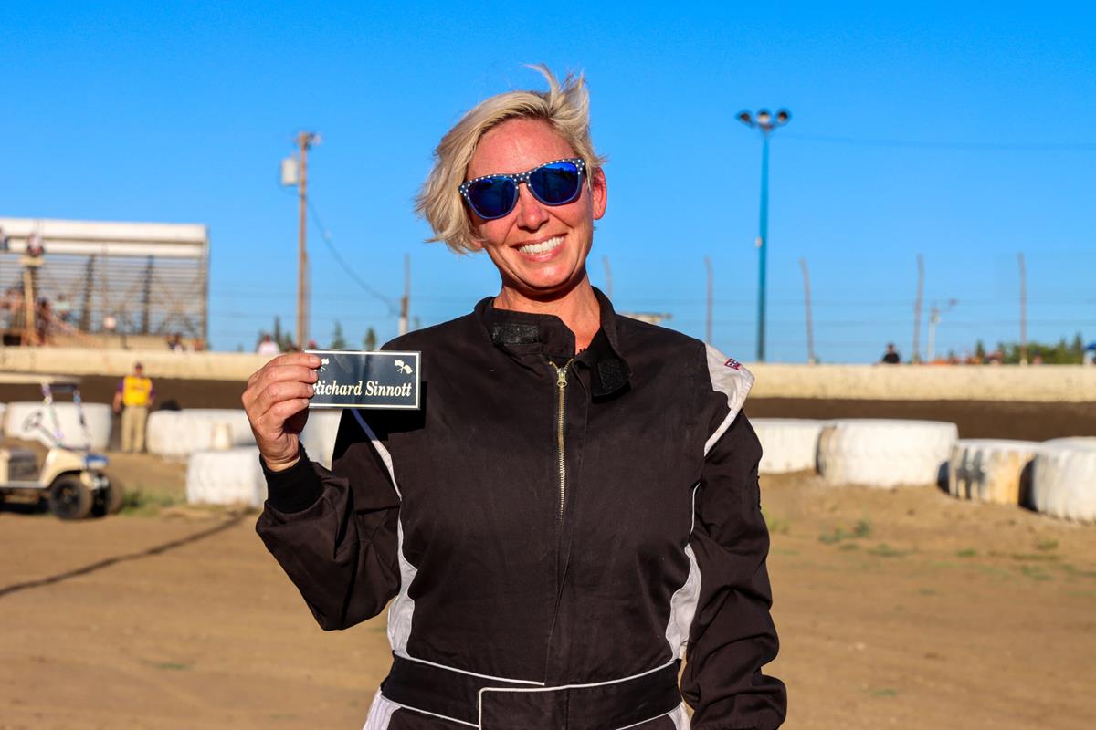 Marysville, CA – (7-2-22) …The Fast Cars and Freedom event provided some of the best racing seen all season long at the Marysville Raceway. Point race No. 11 was also in tribute to the late, great, Richard Sinnott. The track was honored to remember Richard during the special Friday night race. Misty Castleberry led an all-star lineup of Crate Sprint Cars, classic custom cars, a box stock kart, and the original rocking No. 04 Super Stock around the Marysville Raceway in an emotional tribute to her dad. At the end of the Memorial Laps, Misty pulled into the infield and placed her dad’s name on the infield plaque area.