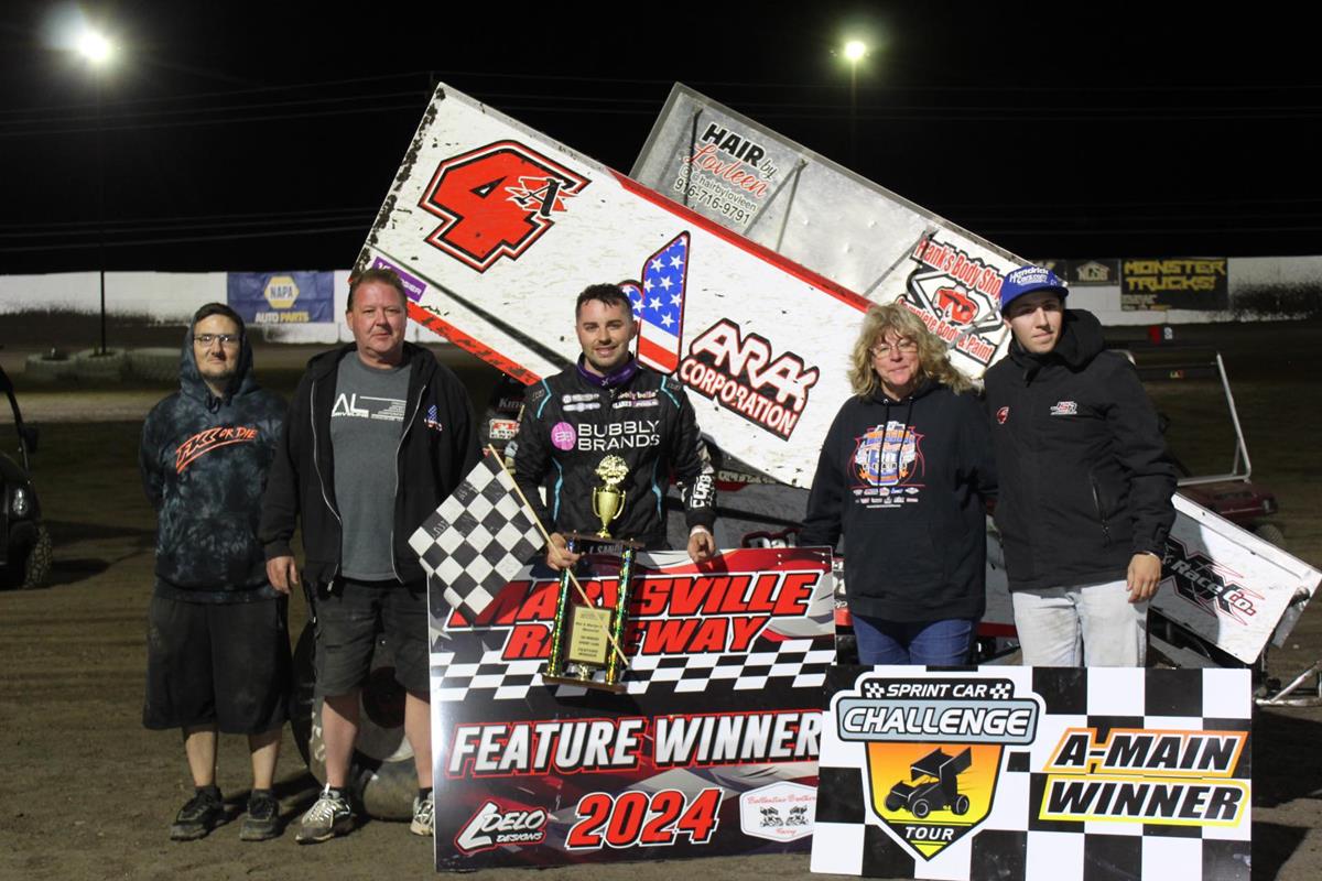 Aromas, California’s Justin Sanders continued his torrid pace to start the Sprint Car Challenge Tour season, racing to his third victory in as many races on Saturday at Marysville Raceway’s Mel & Marlyn Hall Memorial.