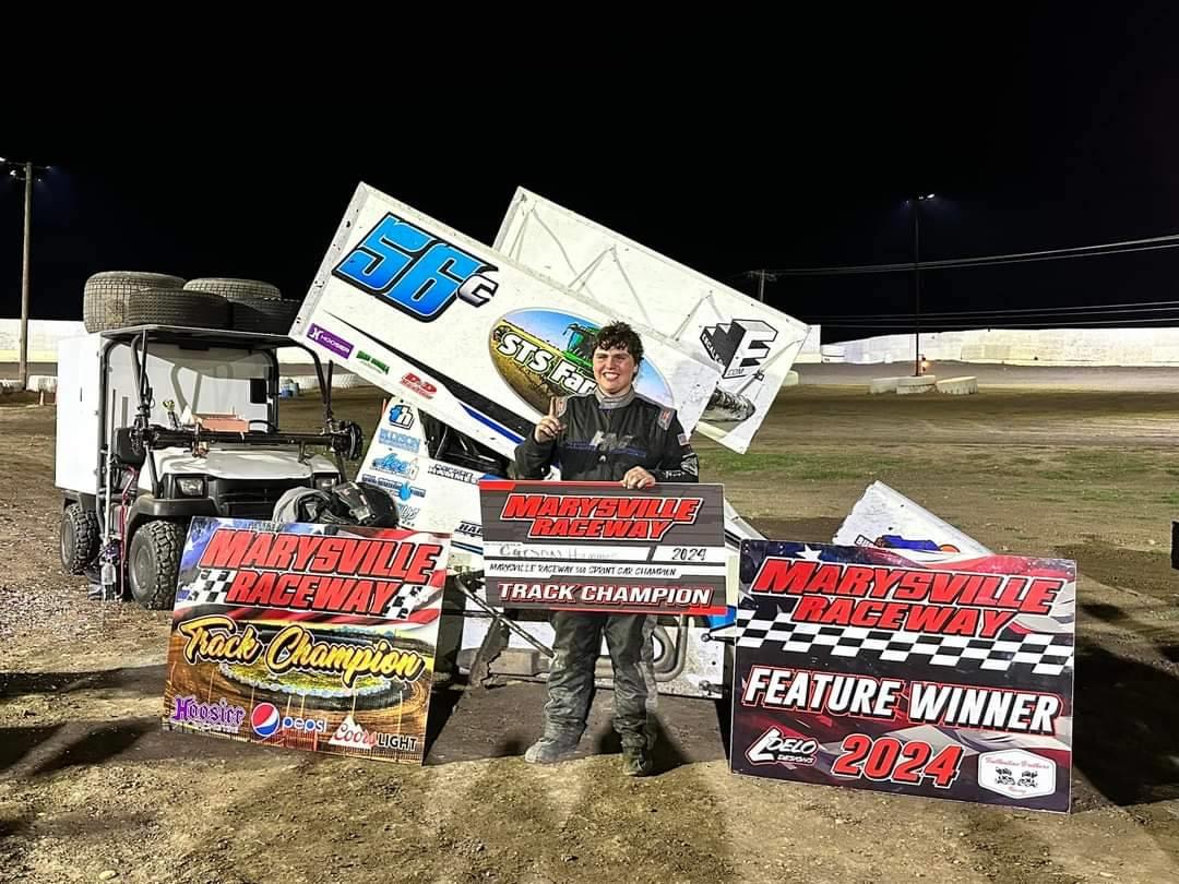 MARYSVILLE, Calif., September 14, 2024…The Marysville Raceway wants to congratulate two new track champions. After Saturday night’s race, Marysville’s 17-year-old sprint car phenom Carson Hammes won the 360-track championship by 37 points over older brother Dawson. Carson won the title in grand fashion, as he also led all 25-laps to win his third main event of the season. Hammes thanked his family in victory lane. “I want to first thank my mom for all of her support,” said Hammes. “In the shop it’s just my dad and my brother and me working on these two cars most of the time. It feels great to win the track championship.” Carson congratulated his brother on a good season also. Dawson won two main events and probably would have been closer to his brother if not for some mechanical gremlins late in the season. Dryver Dothage finished sixth in the main event, but it was good enough to secure the third spot in points. Chasing Hammes to the checkered flag were Jake Haulot and Cody Gray. William Fielding ran a strong fourth. Carson Hall charged into fifth place. A total of 20 cars attended the final point show of 2024.